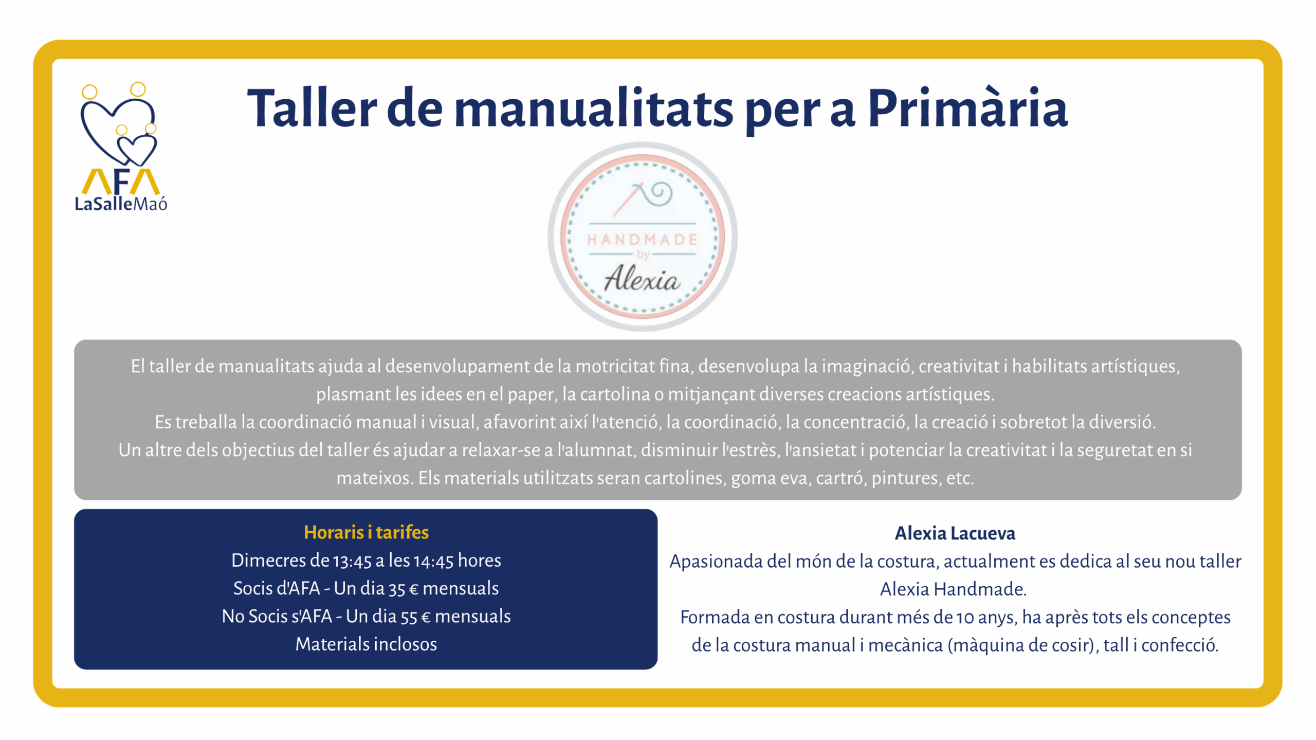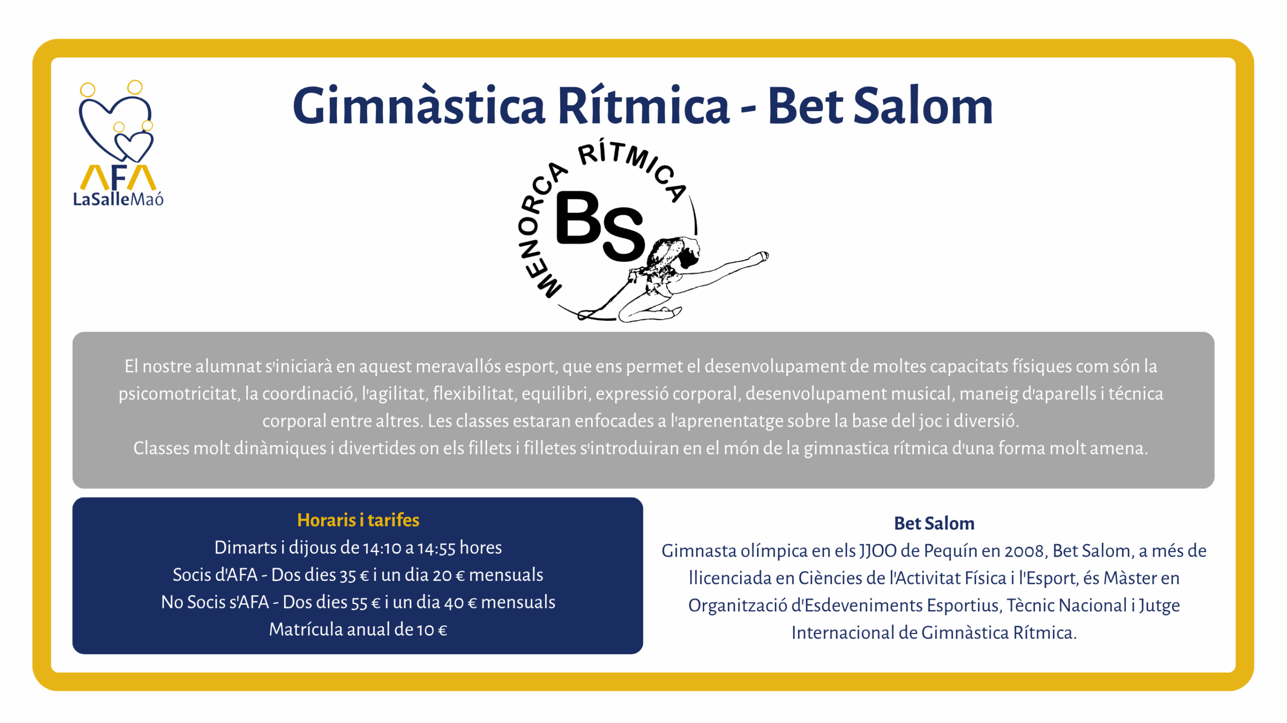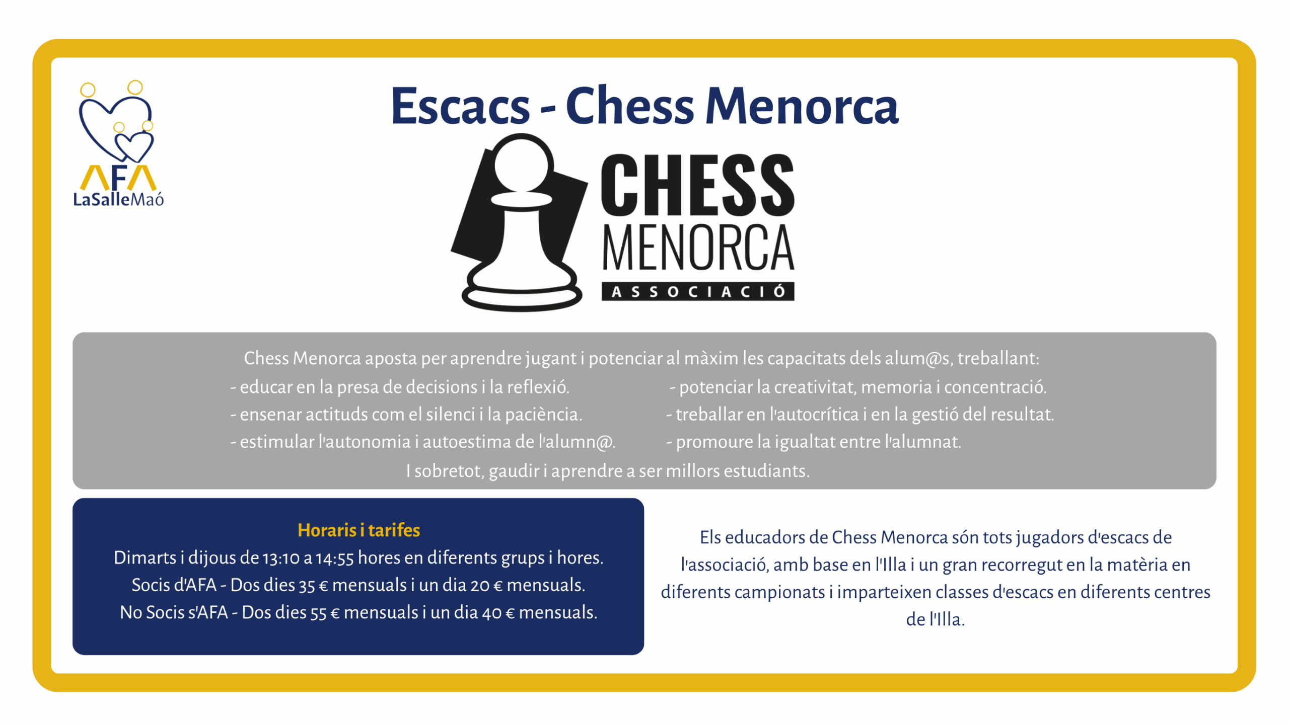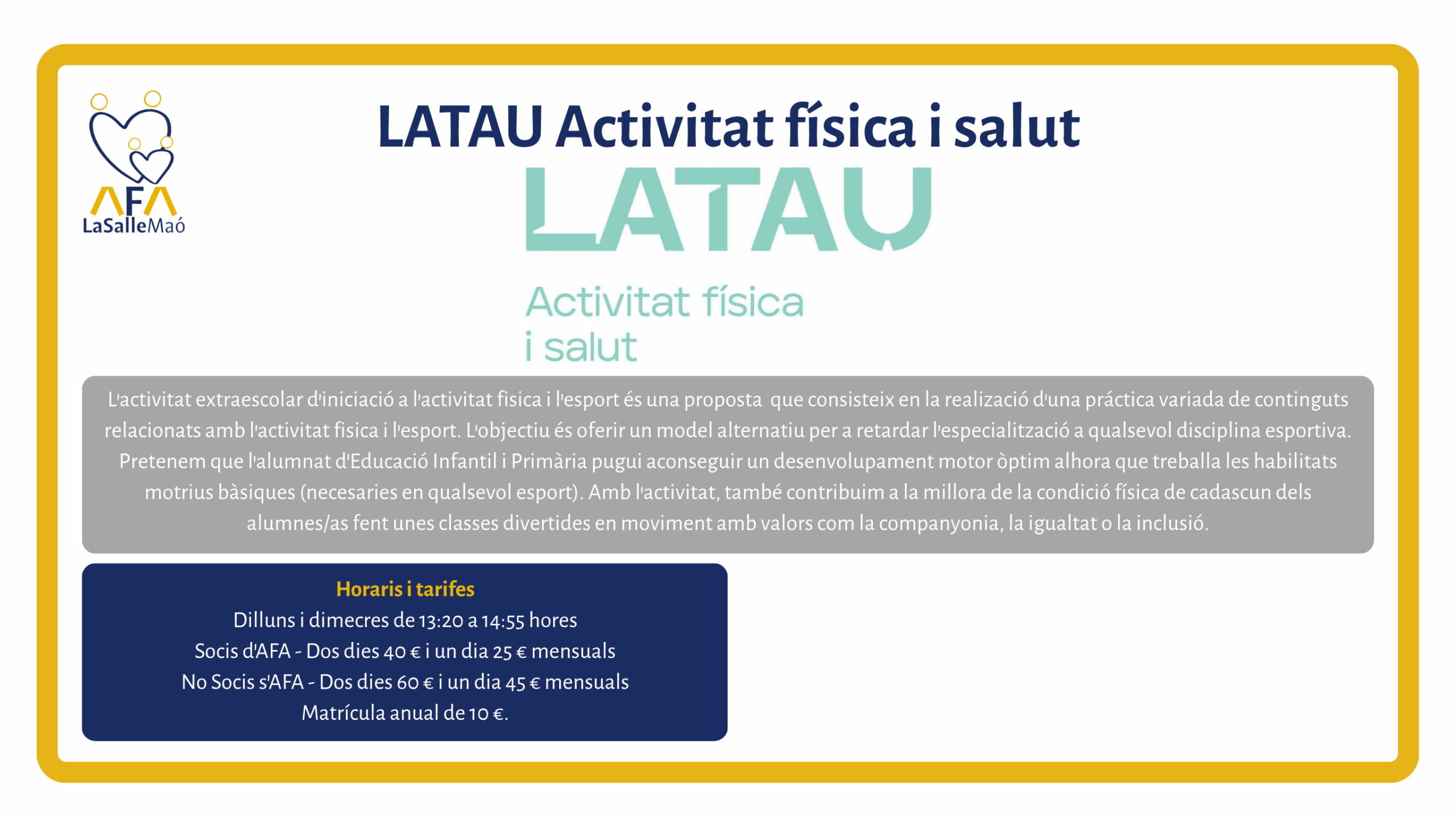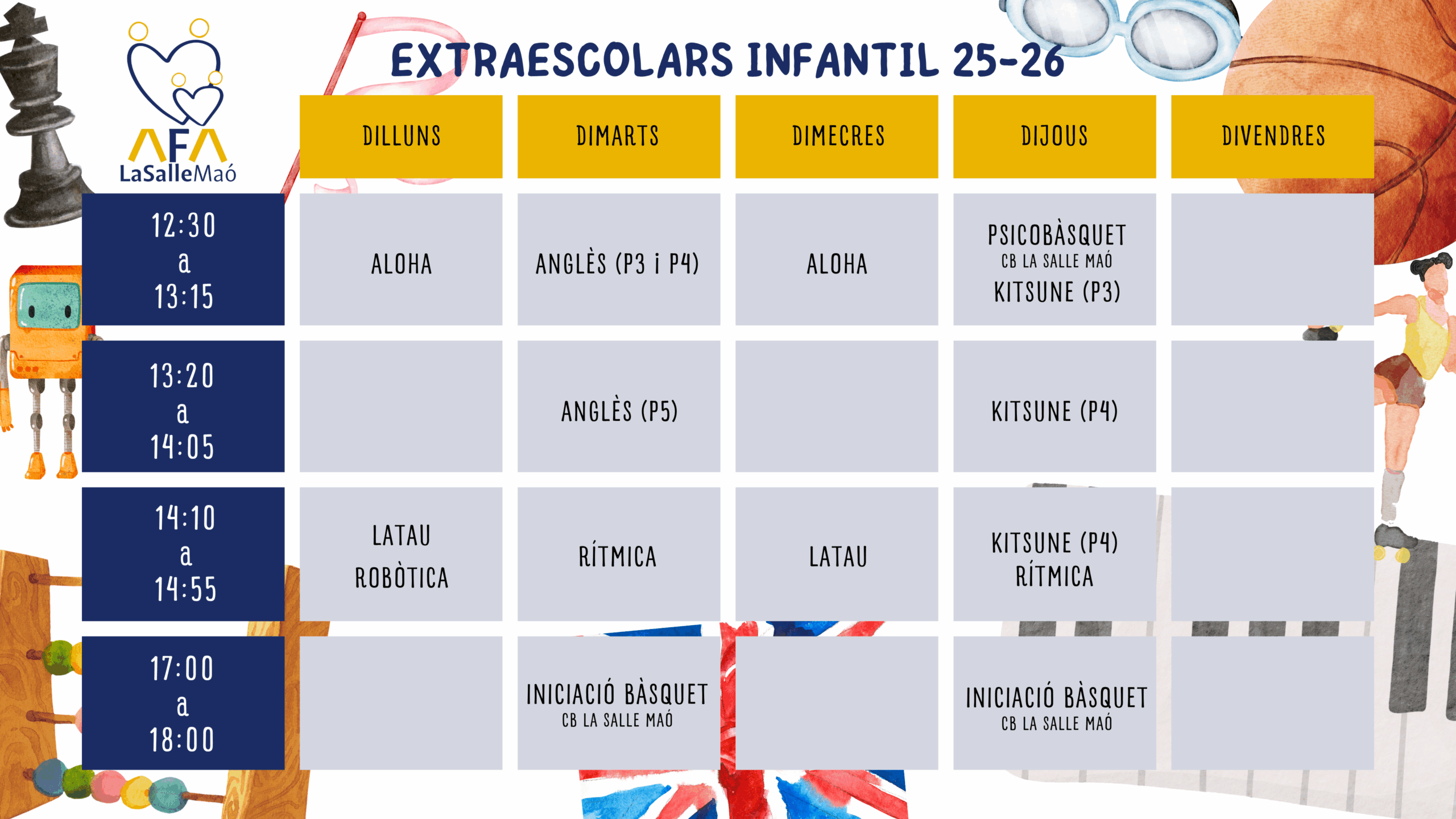 Per completar l’horari escolar i formatiu del nostre alumnat, l’Associació de Famílies de La Salle Maó proposa un ampli ventall d’activitats extraescolar fora d’horari lectiu, tant al migdia com el capvespre. Tota l’oferta d’activitats del centre està dissenyada, organitzada i coordinada per l’AMPA de l’escola en constant diàleg amb el centre educatiu.